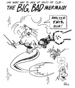 Also, thanks to Eric Hess who belatedly contributed to the debate over how to save The Little Mermaid comic book, back around the time when Disney was trying to explain why cutting all their regular comic titles except for reprints was a good thing. Eric’s rather succinct visual speculation not only appears here, but has me trying to think of way to con Kevin Dooley, my editor on Aquaman, into letting her make a guest appearance in that title.
