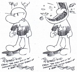 Actually, I’ve gotten so much positive response on the Neil Gaiman Sandman one from last time, it seems to have given the whole thing credibility. Certainly it was the first Eisner/Harvey/World Fantasy-Award winning character ever to grace an airline sick bag. If Neil could mass produce them, he might have a fallback profession if this writing stuff doesn’t pan out. At any rate…
